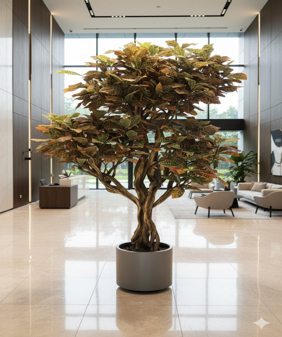 Bring warmth and sophistication to your interiors with this premium handcrafted croton tree. Featuring real wooden branches and lifelike variegated leaves in rich tones of green, gold, and rust, it creates a striking focal point that elevates any environment.